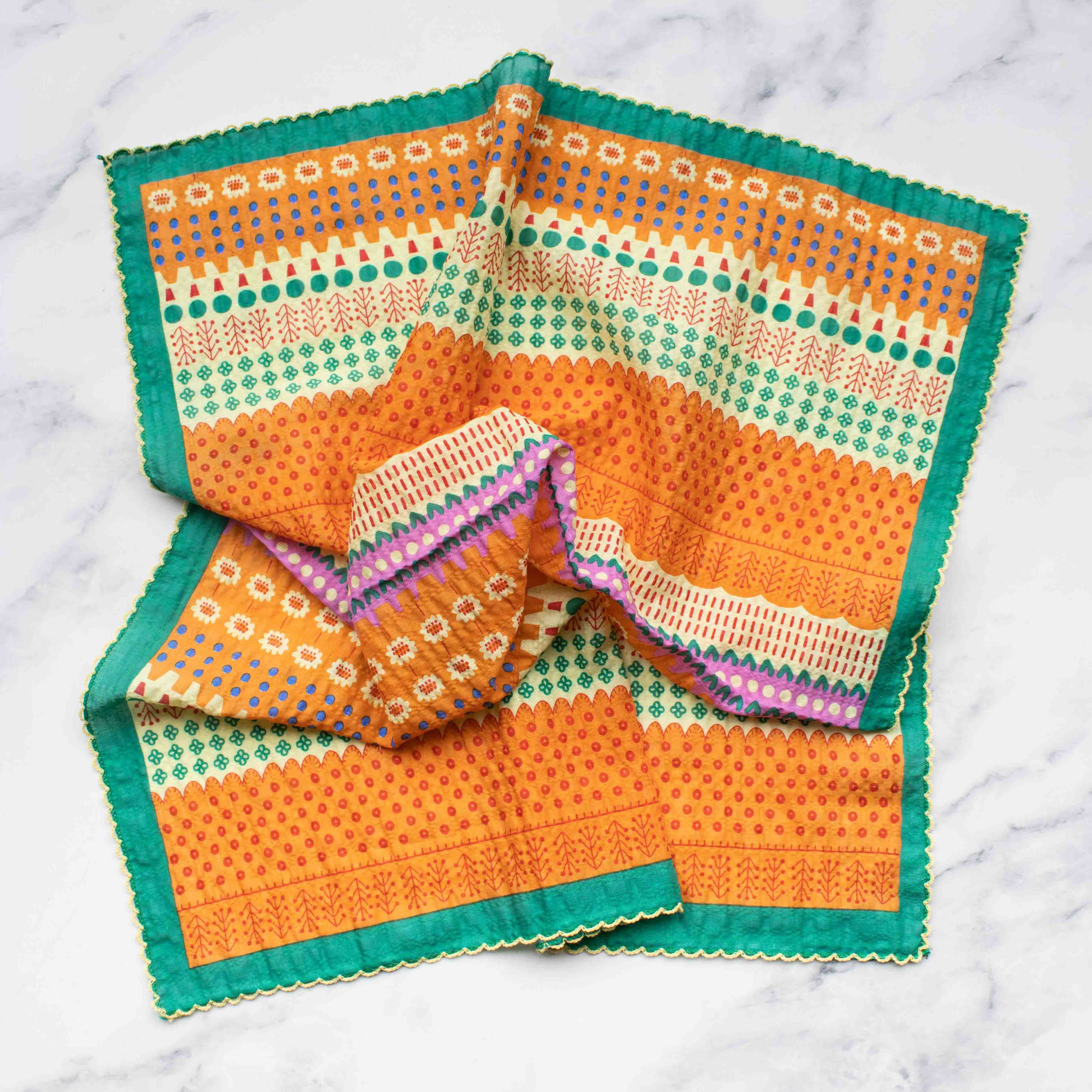 Colorful Patterned Square Scarf – Cotton & Rayon Blend Add a splash of vibrant charm to any outfit with this square scarf crafted from a soft cotton and rayon blend. Featuring playful stripes of florals, polka dots, and geometric patterns, this lightweight scarf brings together tradition and whimsy in a modern design. Available in vivid colorways like orange/green, green/red, and blue/purple, it’s perfect for tying around your neck, bag, or hair for a cheerful accent. Material: 60% Cotton, 40% Rayon Size: Approx. 21"X21" (55mmX55mm)