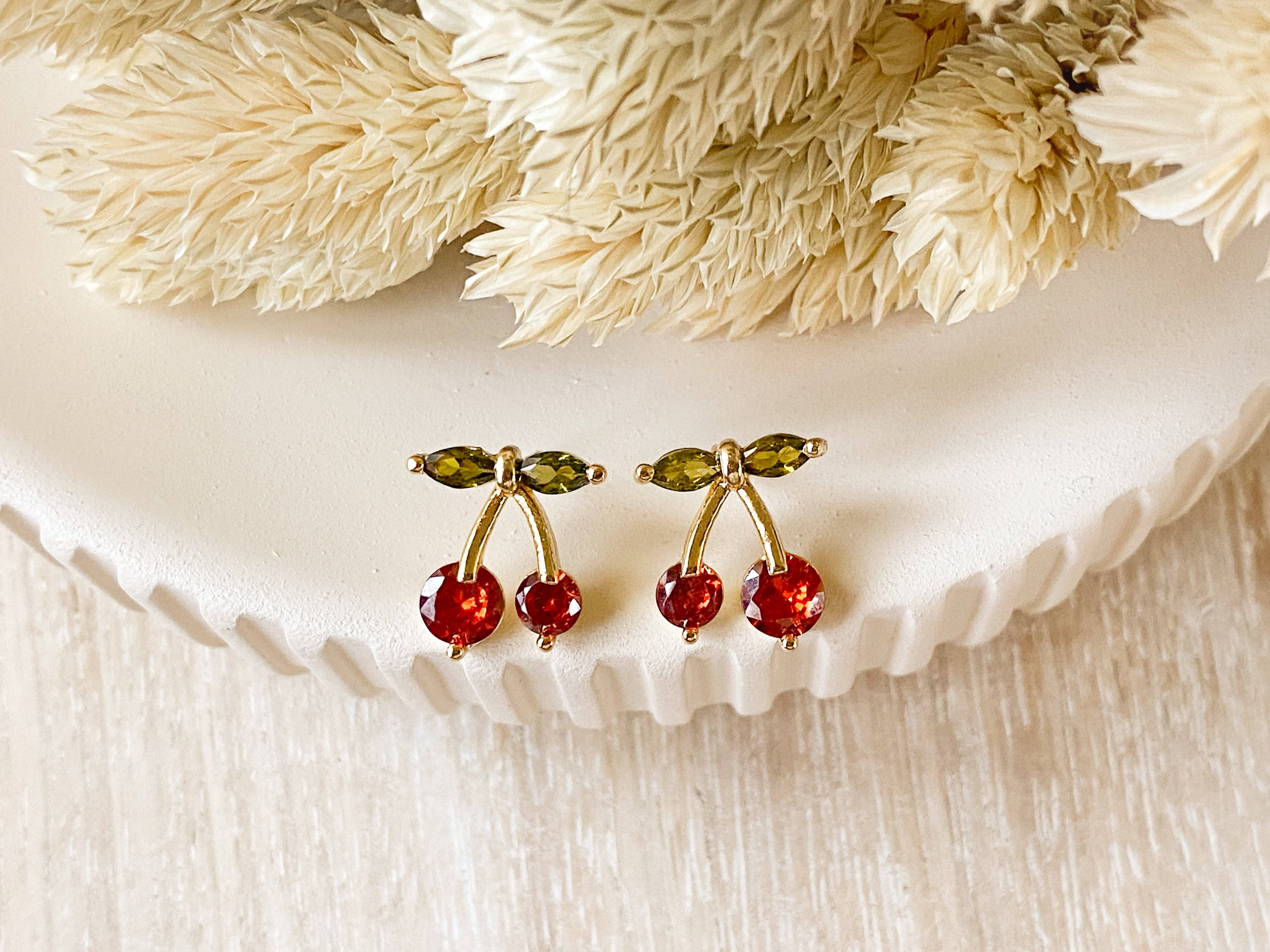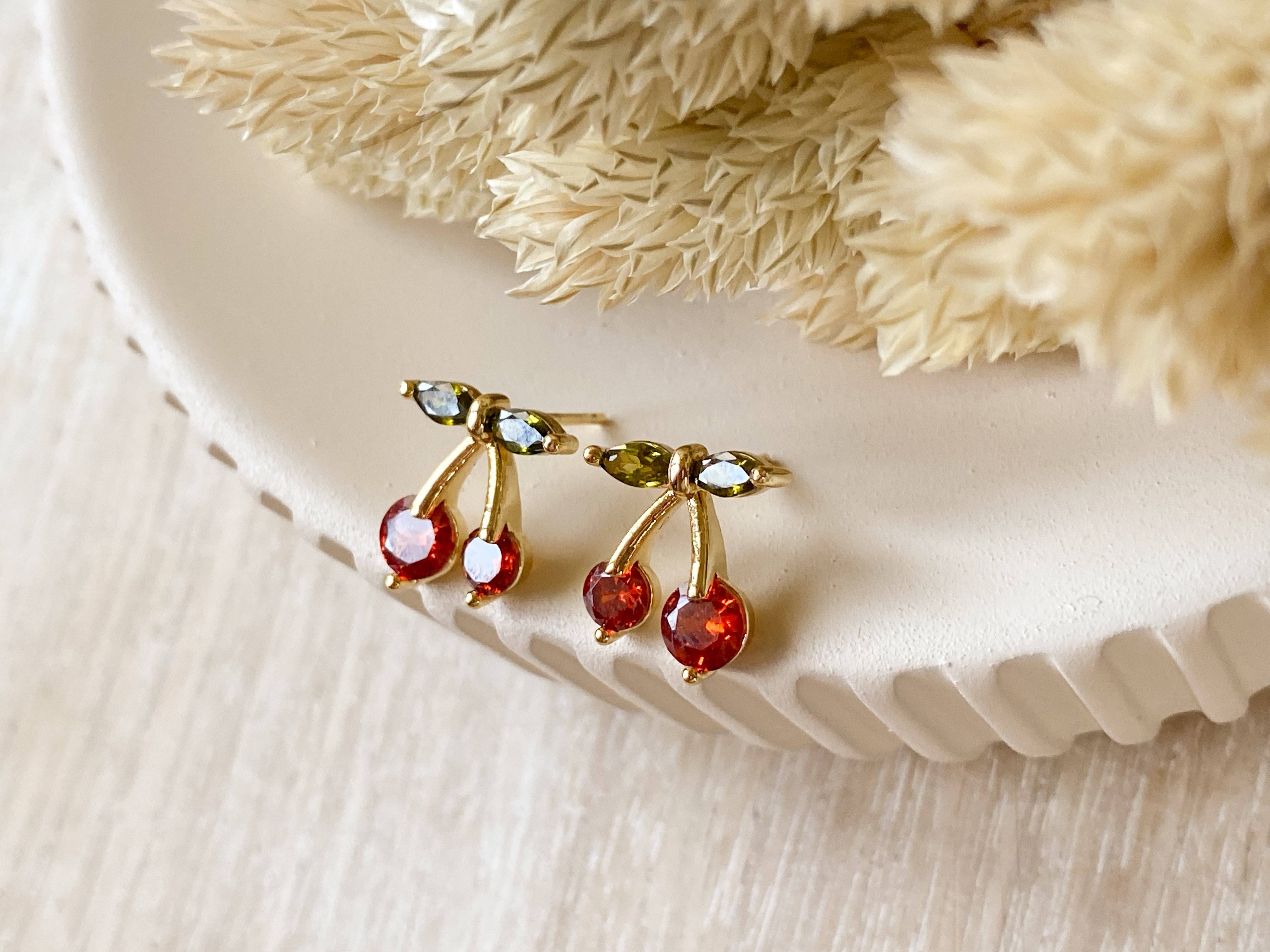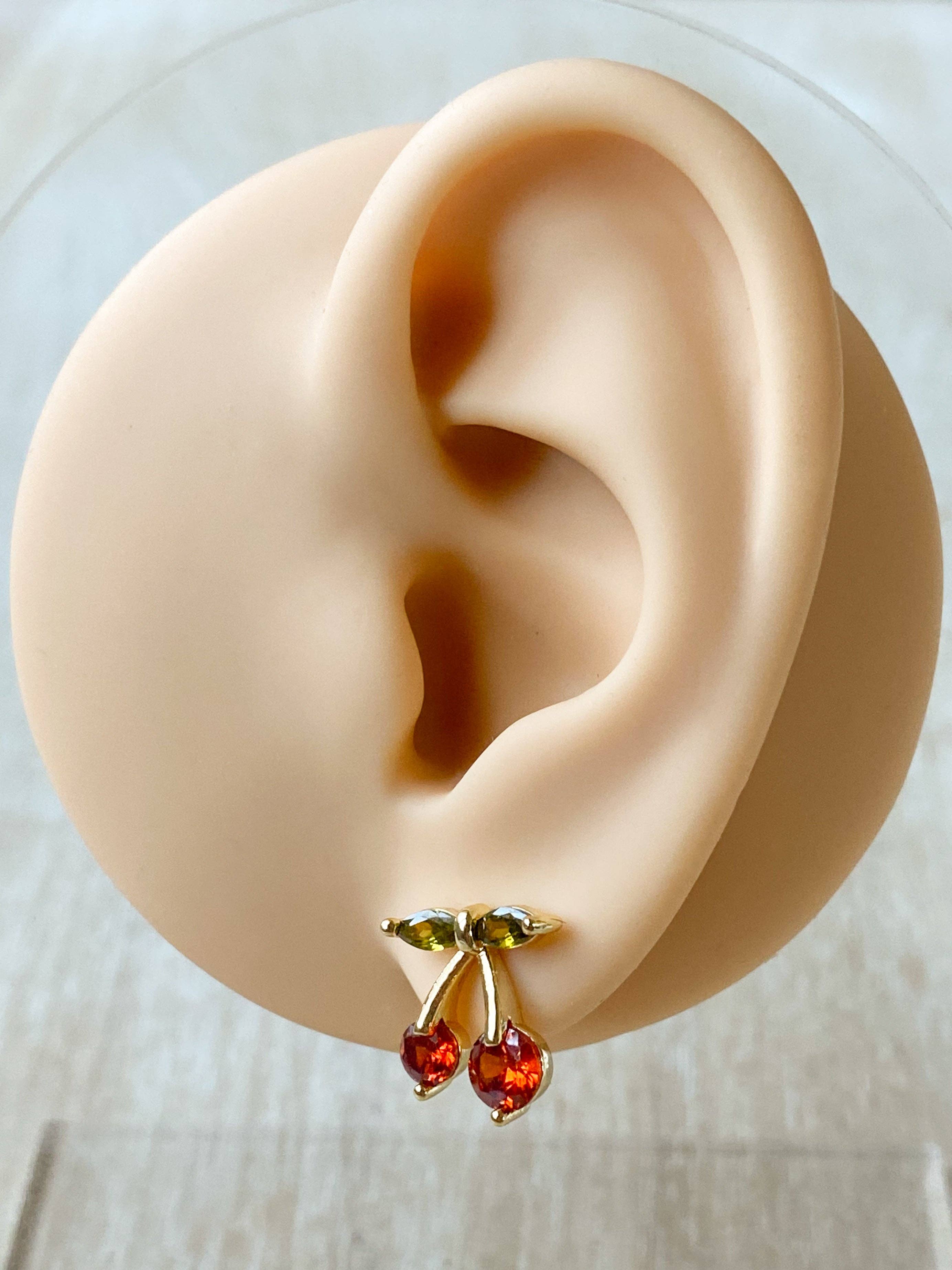 Sweet as summer! These cherry stud earrings sparkle with red and green cubic zirconia and are set in 14K gold-plated brass. Nickel-free and berry cute — perfect for adding a little orchard charm to your day.