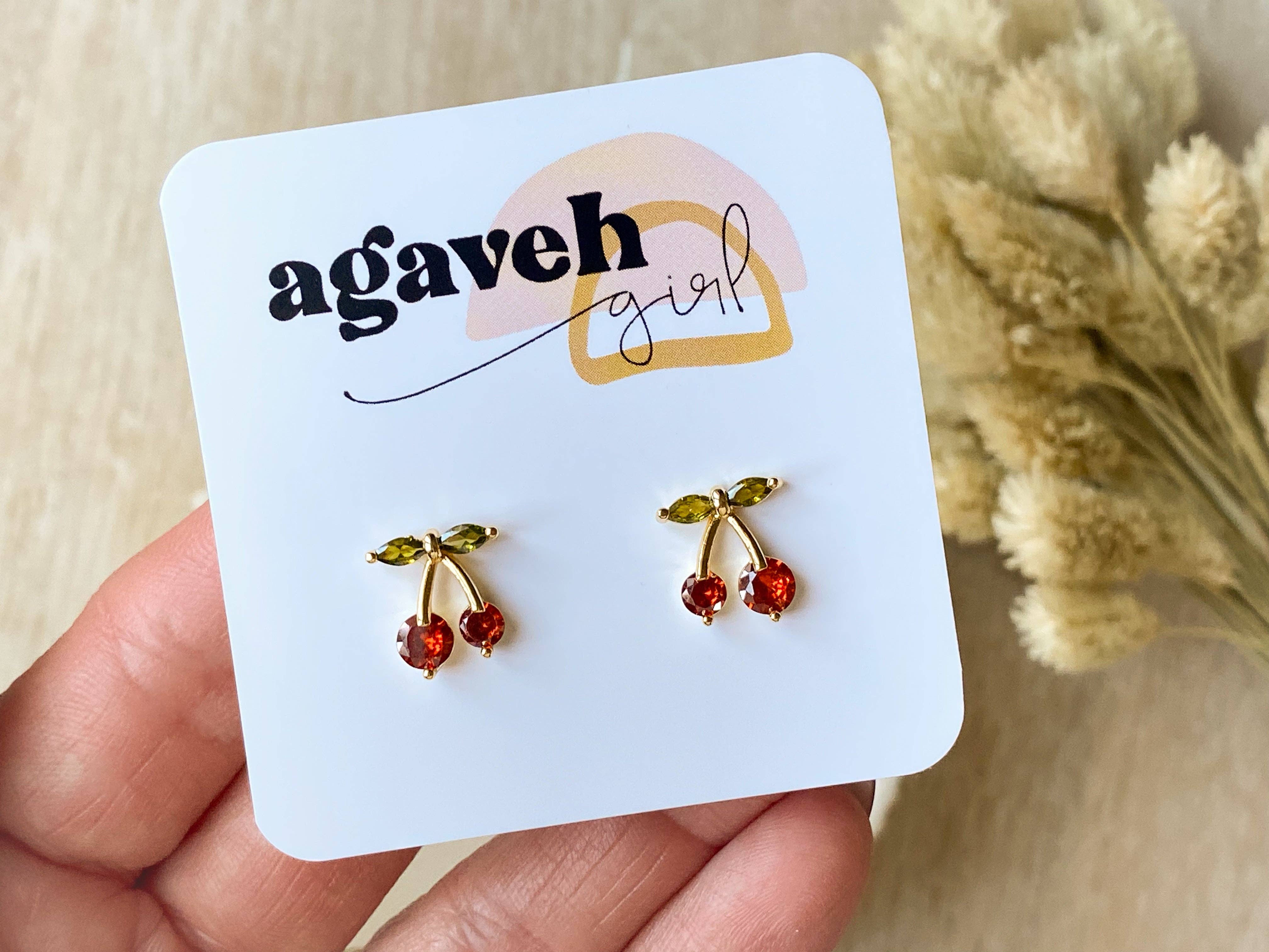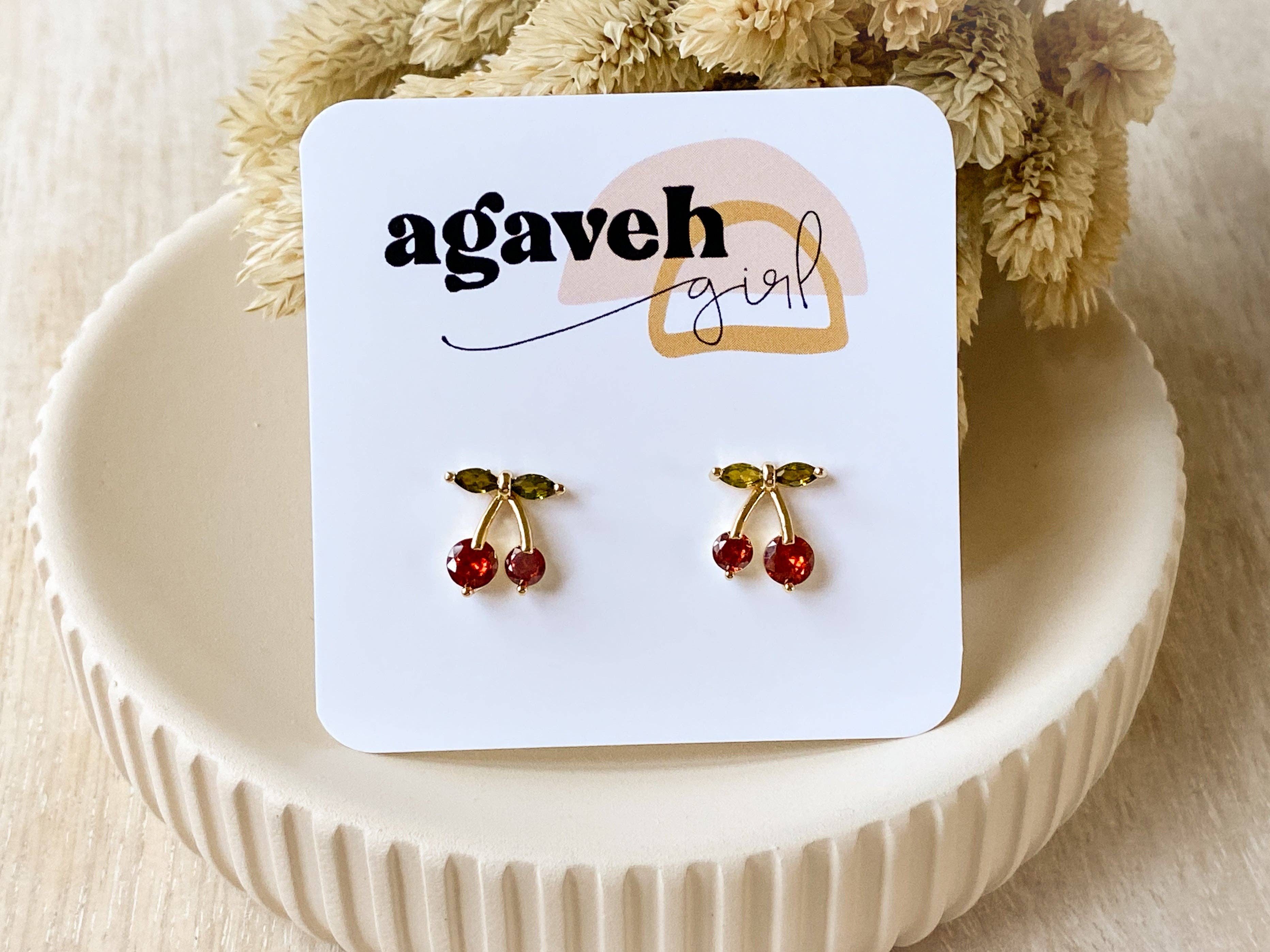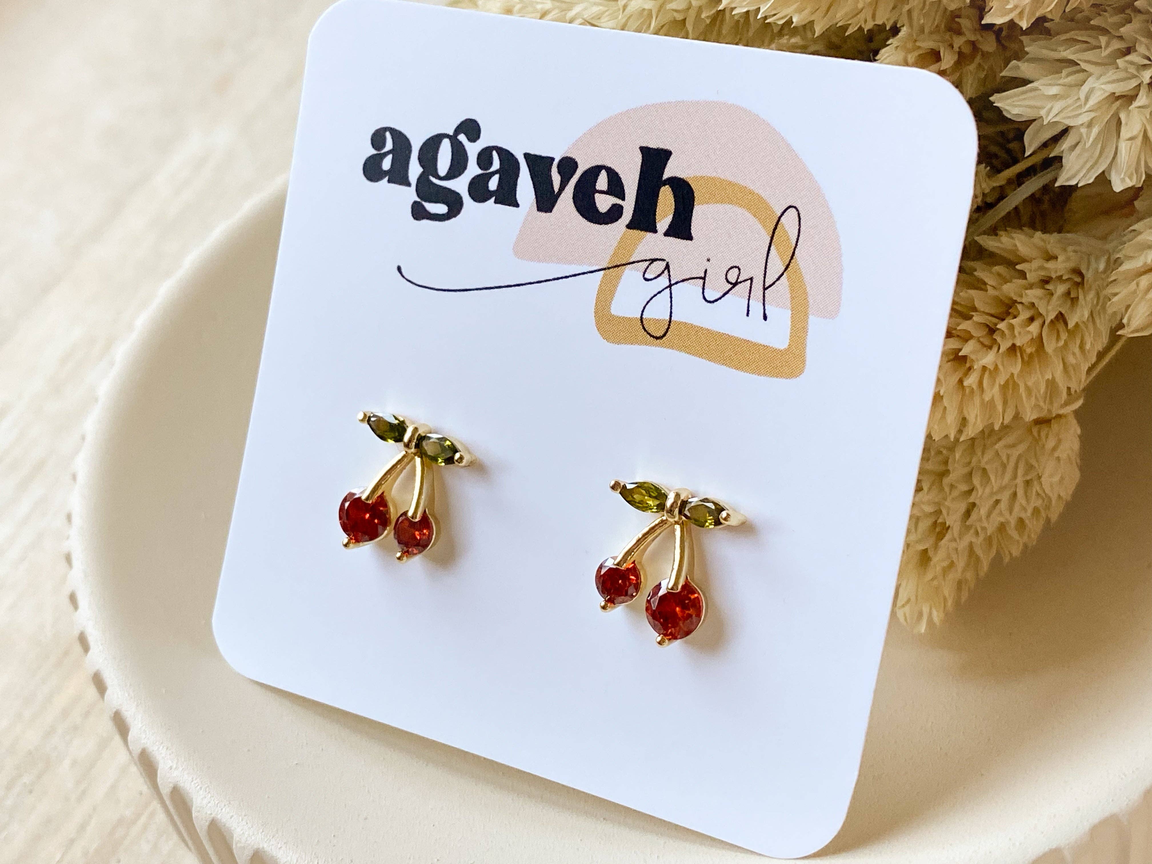 Sweet as summer! These cherry stud earrings sparkle with red and green cubic zirconia and are set in 14K gold-plated brass. Nickel-free and berry cute — perfect for adding a little orchard charm to your day.