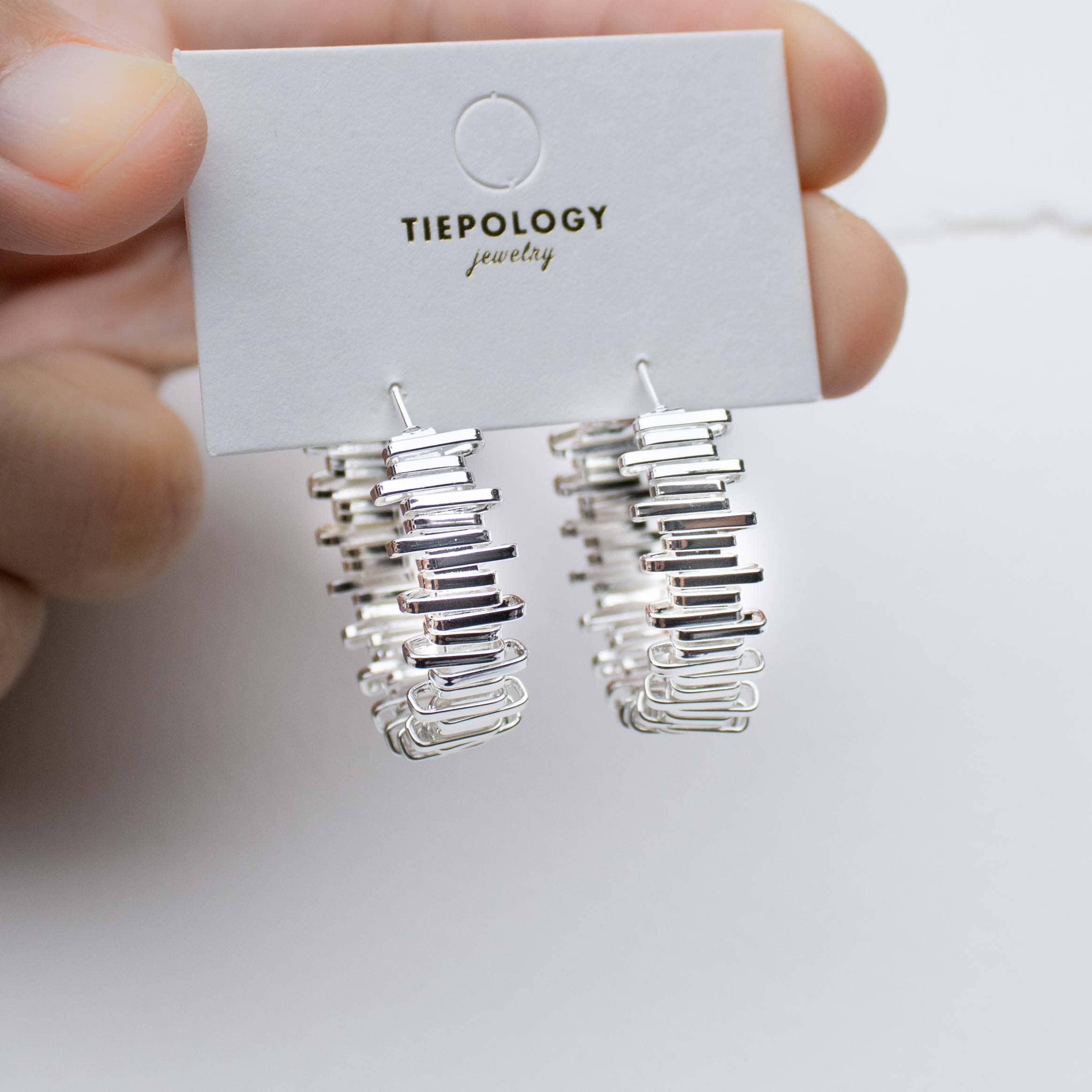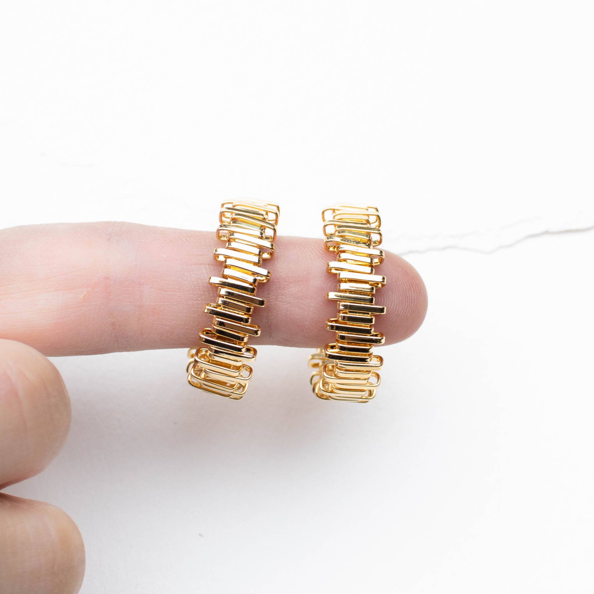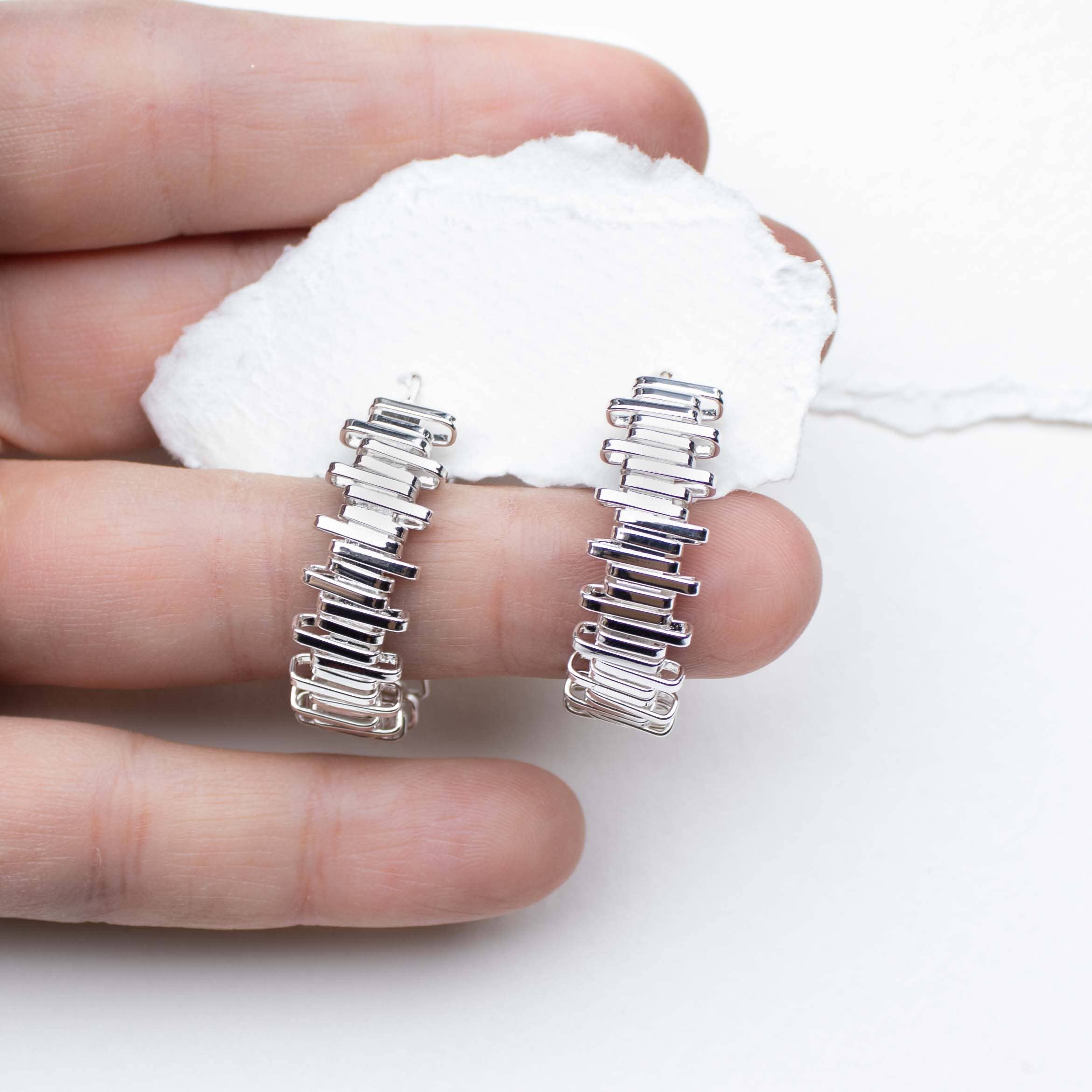 Elevate your accessory game with these modern geometric hoop earrings, available in both gold and silver finishes. Featuring a unique interlocking bar design, these hoops offer a bold yet elegant statement, perfect for everyday wear or special occasions. Lightweight and easy to style, they add a contemporary edge to any outfit.