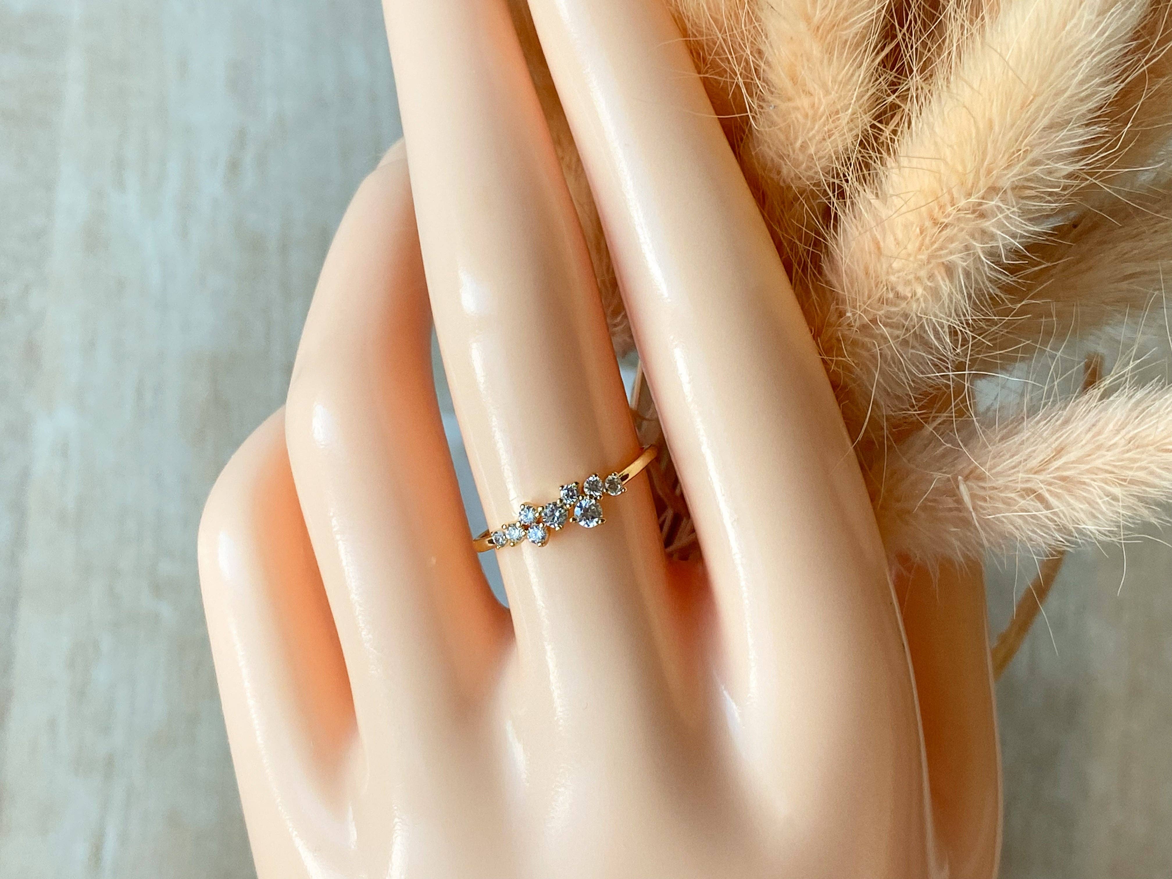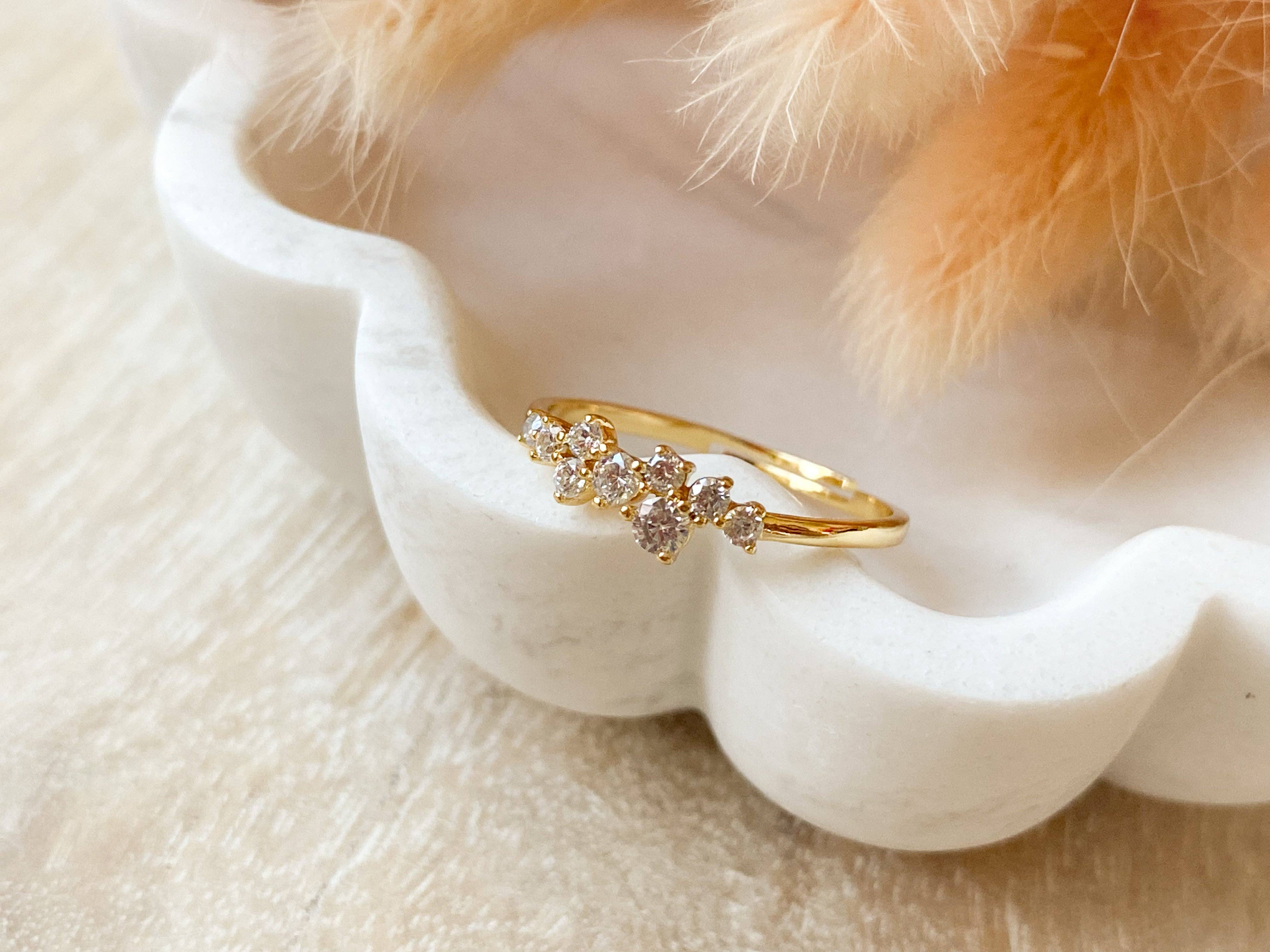 A cluster of sparkle, made to shine. This unique ring features a dainty arrangement of shimmering cubic zirconia stones that catch the light from every angle. Set on an adjustable band and finished in luxe 14K gold plating, it’s designed to fit you just right. Delicate, feminine, and effortlessly eye-catching — the perfect piece for stacking or standing out on its own.