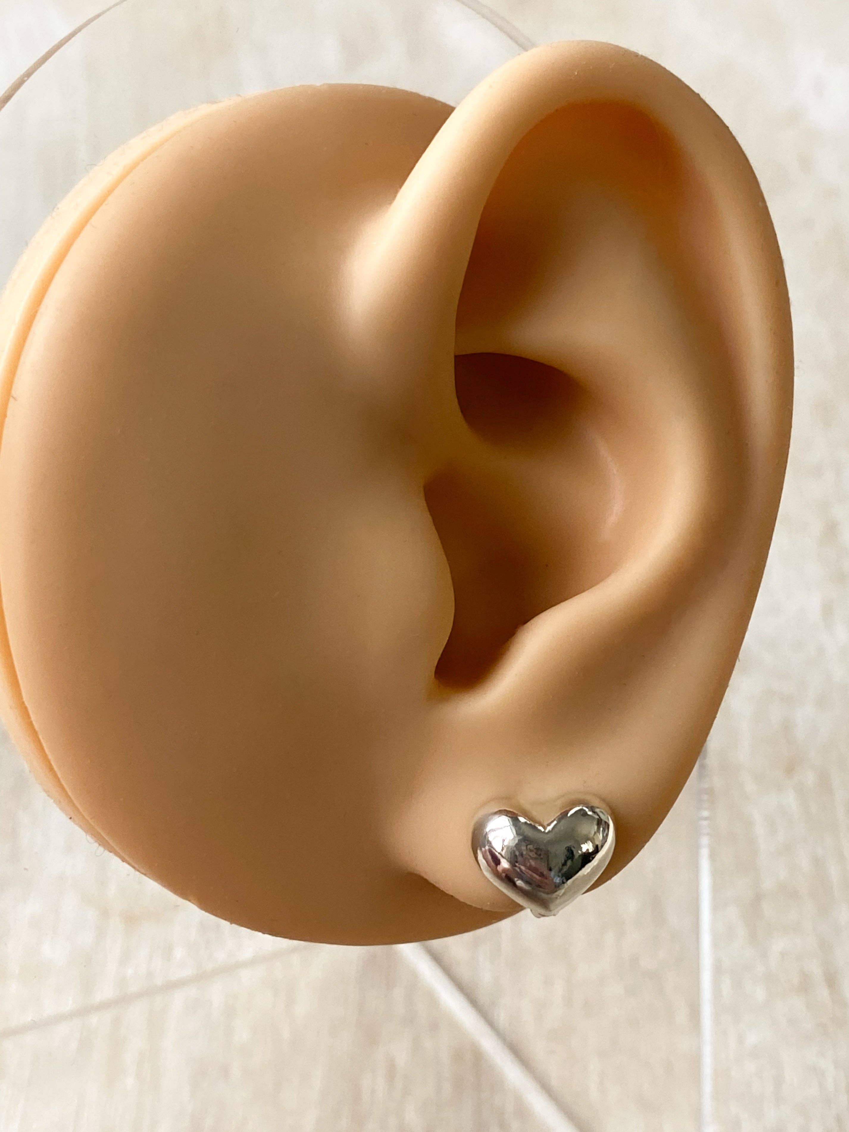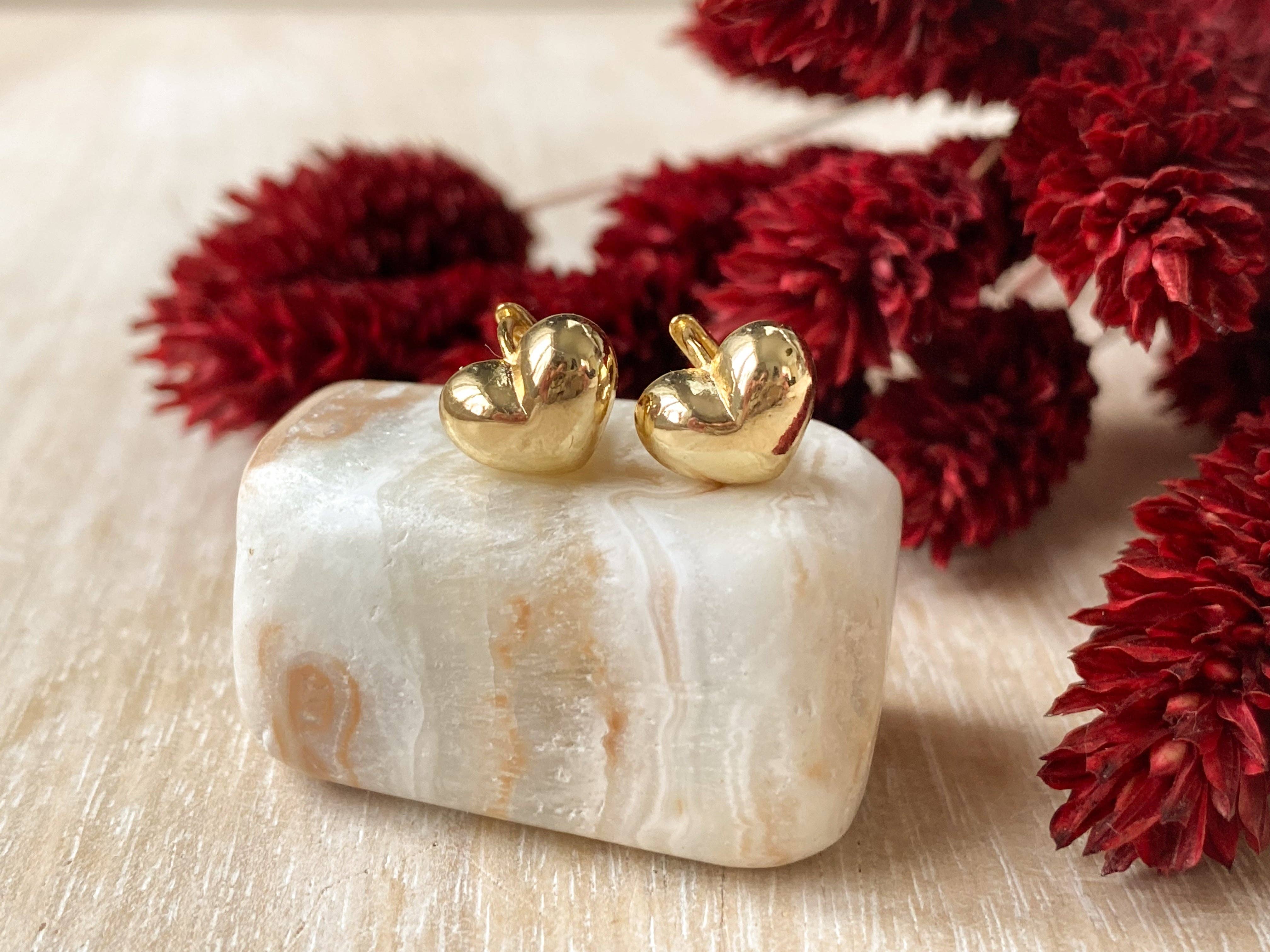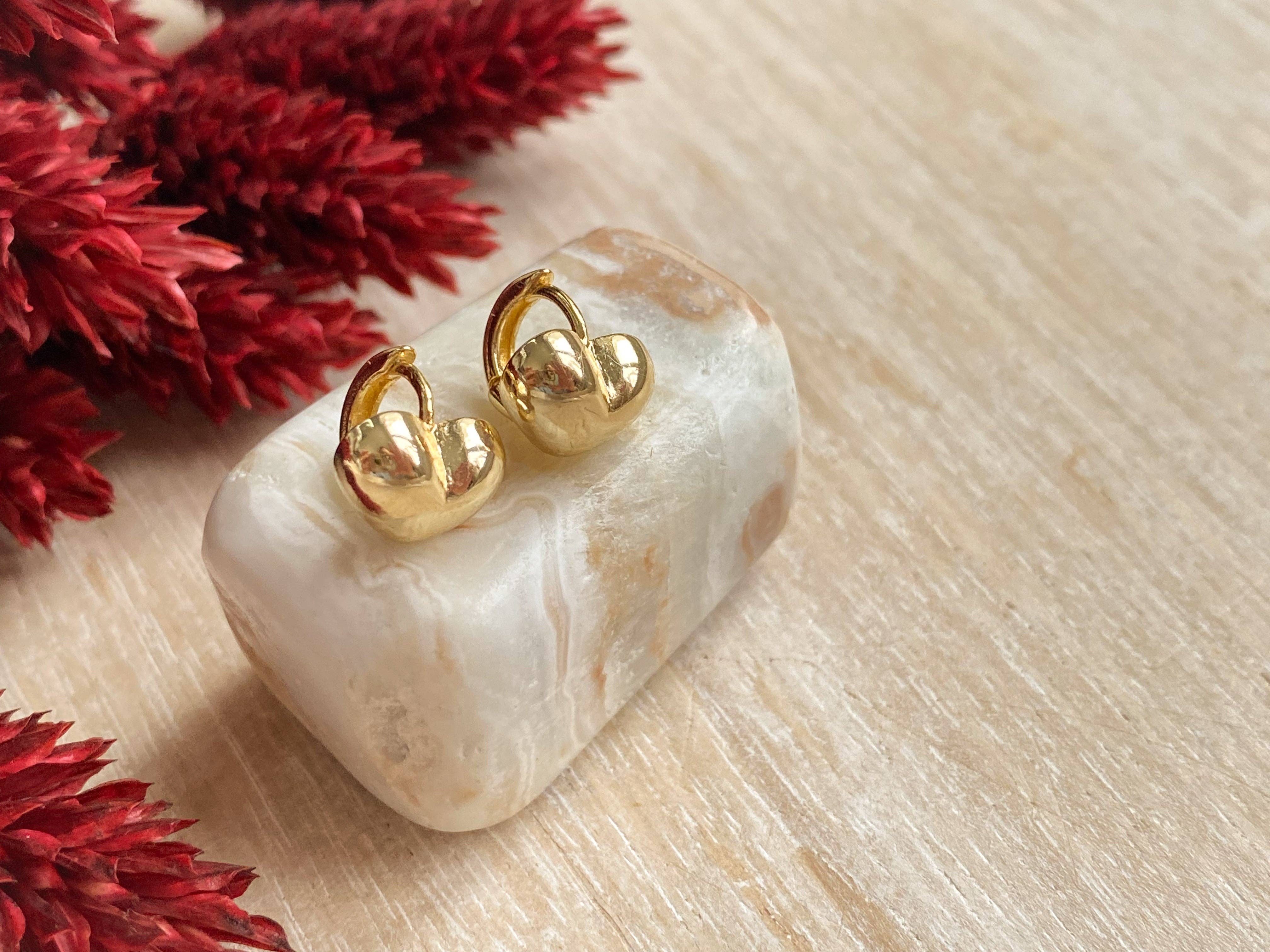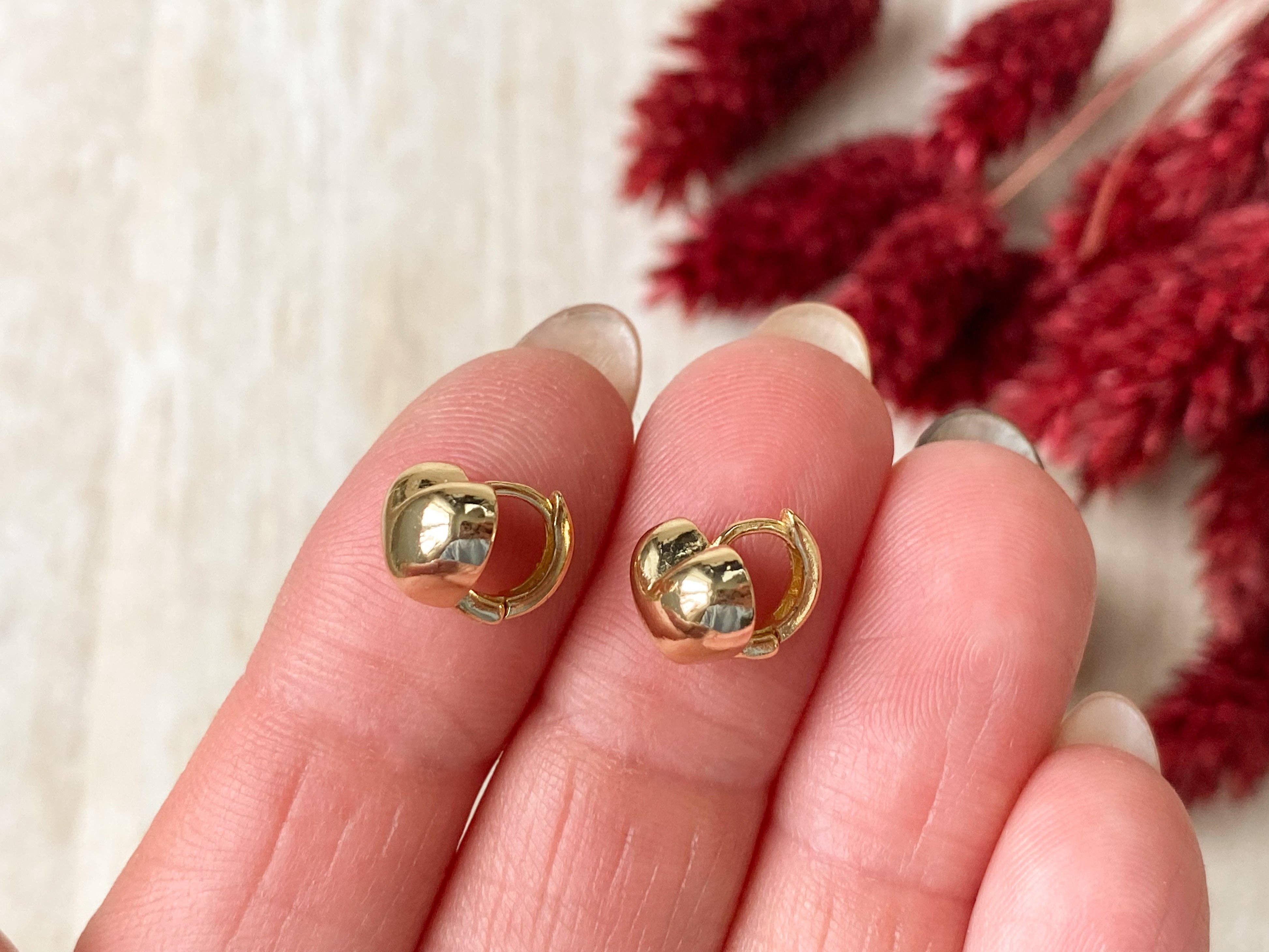 These chic 10mm puffed heart huggie hoops come in 14K gold plating or a polished silver finish. They feature a delicate puffed heart design that adds a playful touch to your everyday look. Lightweight and comfortable, these hoops hug your ears snugly, making them ideal for daily wear. Nickel free and tarnish resistant
