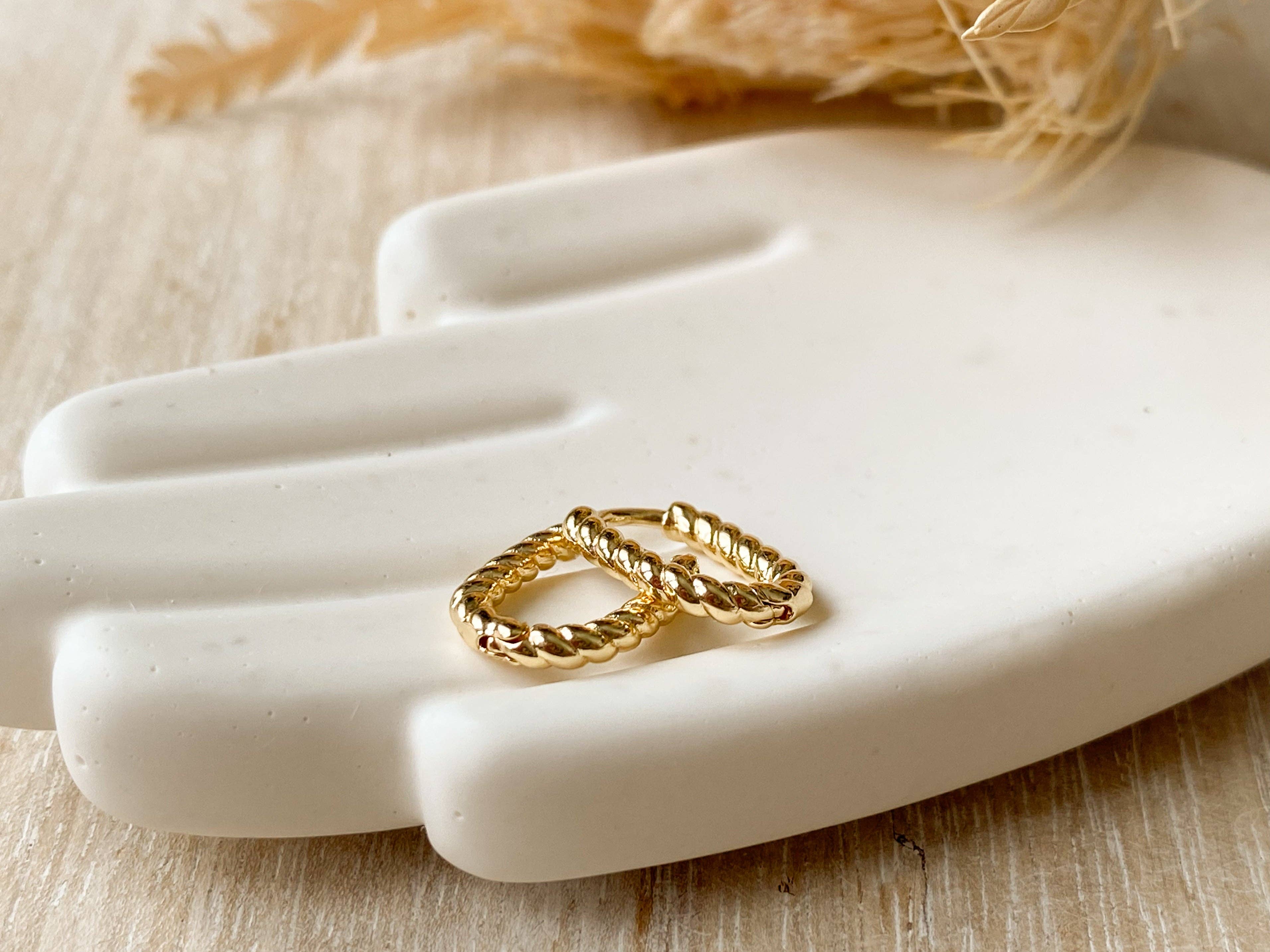 A "U" shaped small hoop that has a twisted appearance. Nickel free and 18K gold plated.