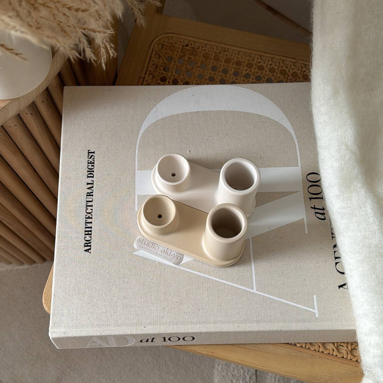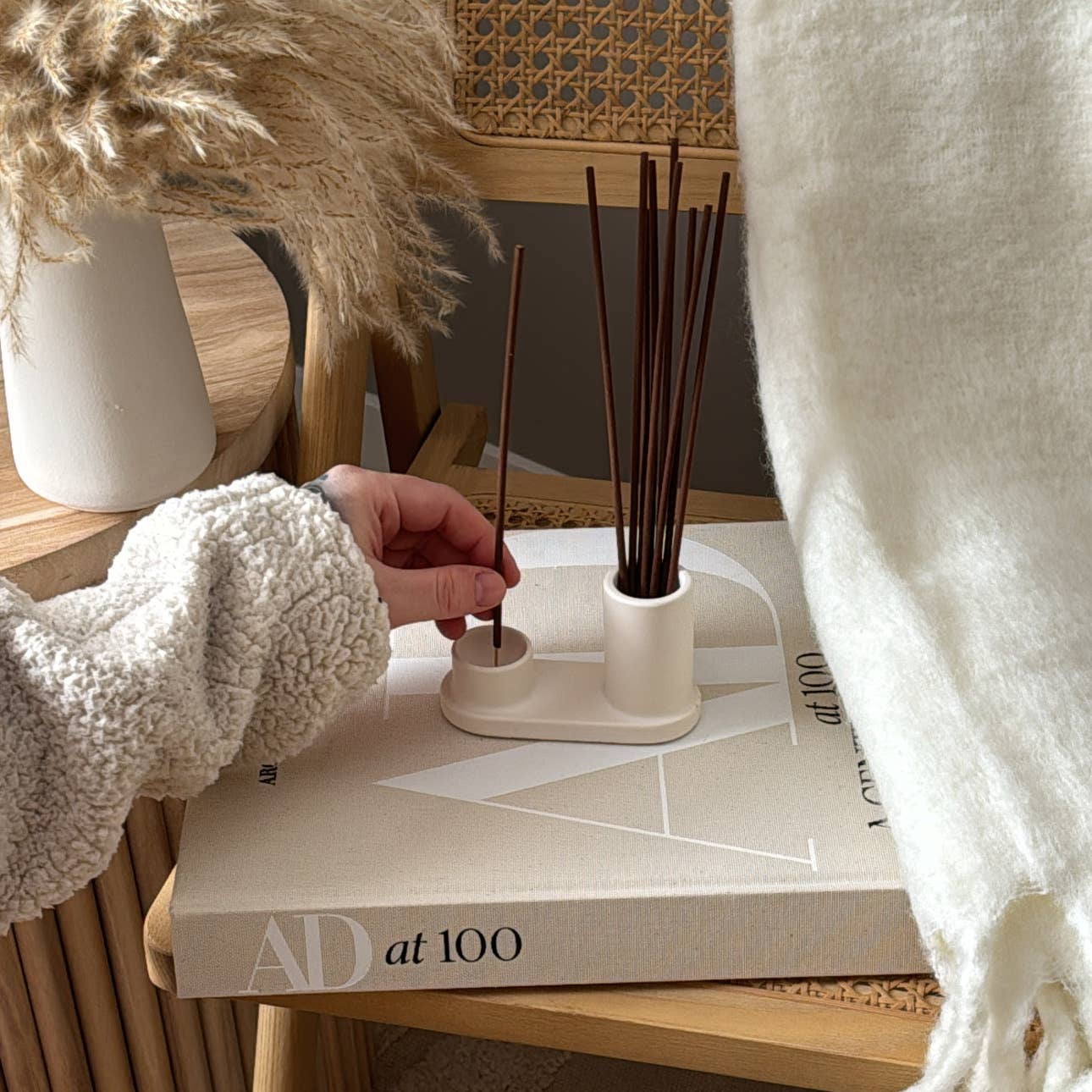 Create a calm and serene ambiance in your home with our neutral range of incense stick holders. Whether you're winding down after a long day or simply looking for a way to find comfort, our handcrafted incense sticks holders feature a variety of stunning minimalist designs ready to be paired with our hand dipped incense sticks for the ultimate moment of peace. The additional holder can be used to store incense sticks, matches, etc. All of our creations are mindfully handmade in our studio located in Edmonton, Alberta and gives back to mental wellness. 〰 Product Details 〰 Comes with cork bottoms to protect surfaces from scratches • Size: 10.8cm x 4.6cm x 6.6cm & 0.4cm hole • Material: Made from Jesmonite • Handcrafted in Alberta, Canada As each piece is mixed and poured by hand, slight imperfections, air bubbles may appear by nature. Color variations can also happen within order. The followings are not considered a fault but a unique feature to each of our pieces.