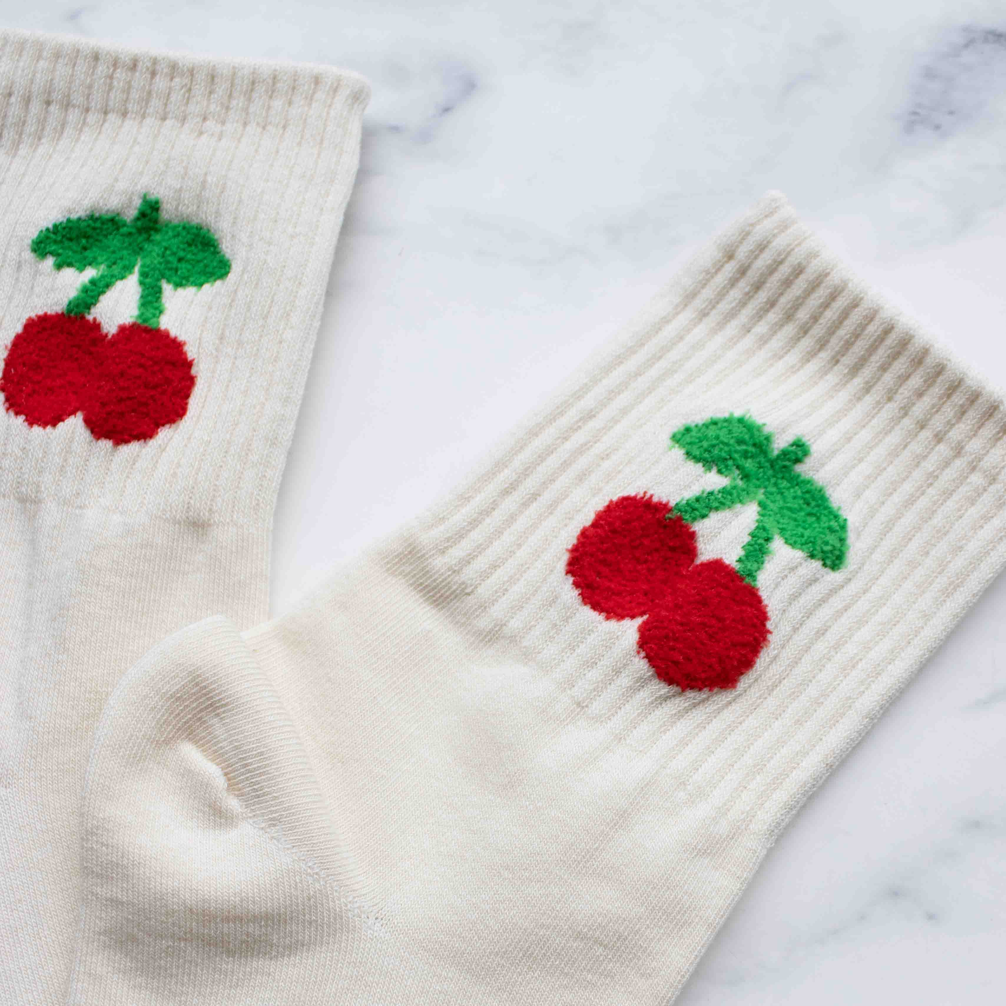 Sweeten up your style with these playful cherry socks! Featuring a vibrant red cherry and green leaf design knitted into a soft cream base, these socks bring a fun, fruity pop to your outfit. The textured embroidery adds a cozy, tactile element—perfect for adding charm to your everyday wardrobe.